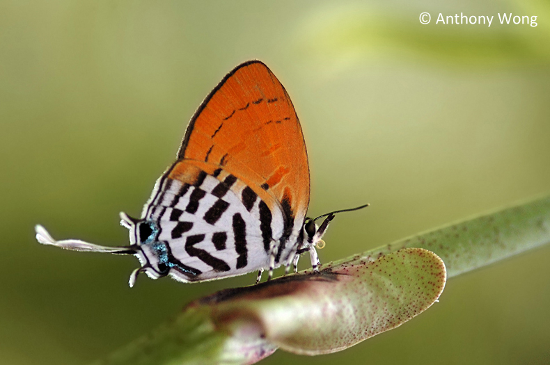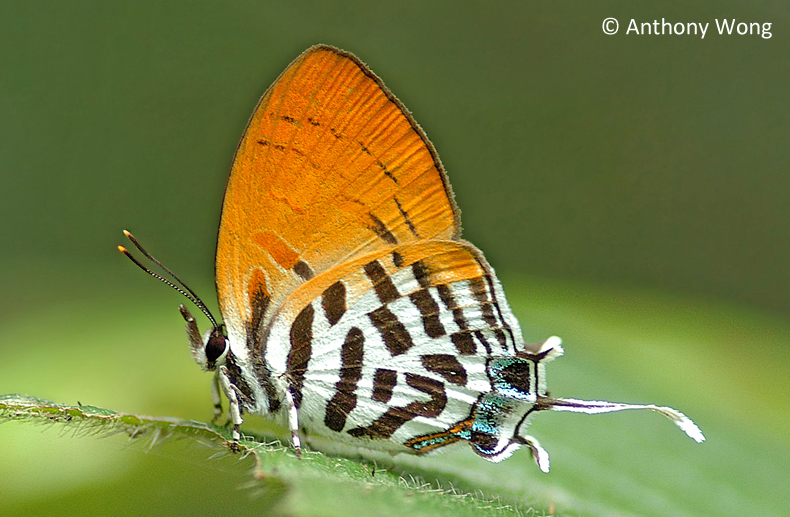 The Common Posy may also often be seen resting with its wings closed, as in this specimen photographed, with its tails in motion. It seems probable that the tails and hindwing pattern serves as a decoy to fool predators into mistaking the tails for the antennae.