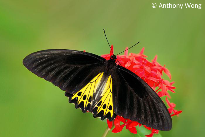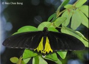 The Common Birdwing is the largest species of the Papilionidae family found in Singapore. The wing expanse of this species, equals and often exceeds that of the famous Rajah Brooke's Birdwing (Trogonoptera brookiana albescens). It is essentially a forest species, but has been drawn to cultivated areas in gardens and parks where its host plant, Aristolochia acuminata, is found. The hindwing of the Common Birdwing is a rich golden yellow edged with black, and the female has a complete series of large black submarginal spots. Rarely, males also have one or more smaller submarginal spots, but never a complete series.