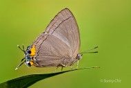 The underside of the butterfly is a drab greyish brown with a pair of orange-crowned eye spots at the tornus of the hindwing. The hindwings bear a pair of white tipped tails.