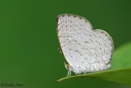 This Lycaenid is unique in that its larva stage is carnivorous! The caterpillar feeds on coccids Dactylopius adonideum which is the "mealy bug" of tea planters. It is a small butterfly - wingspan about 10-14 mm with dark brown wings above, and a greyish buff underside with dark striations. There is a clearly defined white spot at the cell end of the forewing.