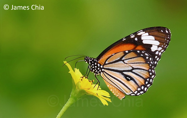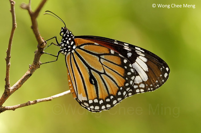 The form-genutia has the hindwings coloured as in the forewings. The butterfly is not commonly encountered in Singapore, but is often seen in the urban and sub-urban areas where it may find its host plant, the creeper-weed Raphistemma pulchellum, growing in a patch of undeveloped land. The Common Tiger is attracted to the dried plants of Heliotropium indicum.